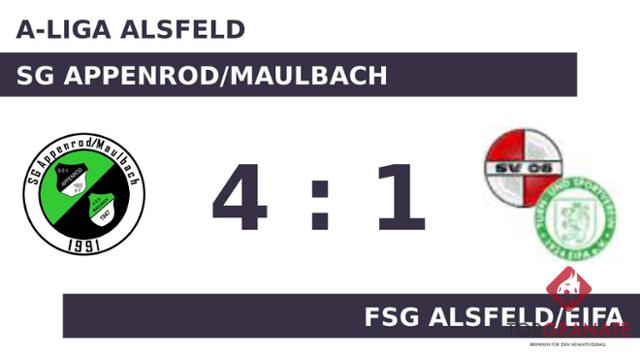 Vor dem Seitenwechsel sorgte Jonas Repp mit seinem Treffer für eine kalte Dusche für die FSG Alsfeld/Eifa. Einen Torerfolg in Halbzeit eins verbuchte lediglich die SG Appenrod/Maulbach, womit man eine knappe Führung mit in die Kabinen nahm. Die FSG Alsfeld/Eifa hatte sich schnell wieder gesammelt und erzielte in Person von Mirko Bambey den Ausgleich (49.). Die SG Appenrod/Maulbach ging durch einen Elfmeter von Tim Stoehr in Führung (55.). Marius Balthasar erhöhte für das Heimteam auf 3:1 (67.). Jannes Kern besorgte in der Schlussphase schließlich den vierten Treffer für die SG Appenrod/Maulbach (86.). Ein starker Auftritt ermöglichte der SG Appenrod/Maulbach am Sonntag einen ungefährdeten Erfolg gegen die FSG Alsfeld/Eifa.
