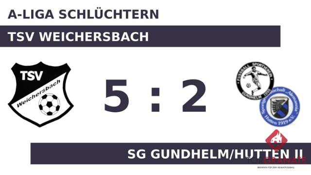 Für das erste Tor sorgte Sascha Gies. In der 14. Minute traf der Spieler der TSV Weichersbach ins Schwarze. Kevin Schneider beförderte das Leder zum 2:0 der TSV über die Linie (32.). Durch einen von Christopher Klüh verwandelten Elfmeter gelang der SG Gundhelm/Hutten II in der 34. Minute der 1:2-Anschlusstreffer. Gies schnürte mit seinem zweiten Treffer einen Doppelpack und brachte seine Mannschaft auf die Siegerstraße (35.). Mit der Führung für die TSV Weichersbach ging es in die Halbzeitpause. In der 63. Minute erhöhte Maximilian Klein mit einem Elfmeter auf 4:1 für die Weichersbacher. In der 68. Minute brachte Hannes Kohlhepp das Netz für Gundhelm/Hutten II zum Zappeln. Per Elfmeter erhöhte Klein in der 90. Minute seine Torausbeute an diesem Tag auf zwei Treffer – 5:2 für die TSV Weichersbach. Als Schiedsrichter Ibrahim Vieth (Nüsttal) die Begegnung beim Stand von 5:2 letztlich abpfiff, hatten die Gastgeber die drei Zähler unter Dach und Fach.