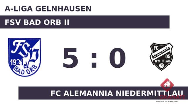 Für das erste Tor sorgte Vincenzo Montaldo. In der zwölften Minute traf der Spieler des FSV Bad Orb II ins Schwarze. Kristijan Romic erhöhte den Vorsprung der FSV-Reserve nach 26 Minuten auf 2:0. Die Hintermannschaft des FC Alemannia Niedermittlau ließ bis zur Pause kein weiteres Tor zu und es ging bei unverändertem Stand in die Kabinen. In der 49. Minute legte Fabian Hein zum 3:0 zugunsten des FSV Bad Orb II nach. Montaldo gelang ein Doppelpack (56./72.), mit dem er das Ergebnis auf 5:0 hochschraubte. Letztlich kam der FSV Bad Orb II gegen die Alem. Niedermittlau zu einem verdienten 5:0-Sieg.