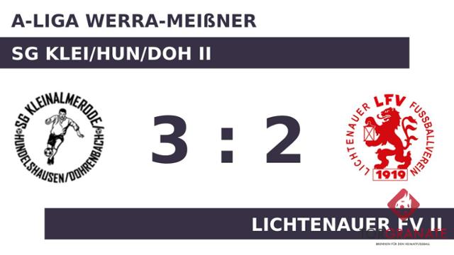 Kevin Träbing brachte den Lichtenauer FV II in der 32. Minute ins Hintertreffen. Ehe der Schiedsrichter Erwin Schellhase (Sontra) die Protagonisten zur Pause bat, traf Atakan Polat zum 1:1 zugunsten der Gäste (45.). Zur Halbzeit war die Partie noch vollkommen offen. Remis lautete das Zwischenresultat. In der 51. Minute brachte Daniel Seelig den Ball im Netz der SG Klei/Hun/Doh II unter. Niklas Fuhrmann ließ sich in der 78. Minute nicht zweimal bitten und verwertete zum 2:2 für den Gastgeber. Sechs Minuten später ging die SG Klei/Hun/Doh II durch den zweiten Treffer von Träbing in Führung. Mit Ablauf der Spielzeit schlug die SG Klei/Hun/Doh II den Lichtenauer FV II 3:2.