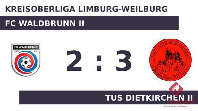 Louis Zabel brachte dem TUS Dietkirchen II nach 30 Minuten die 1:0-Führung. Paul Steinhauer machte in der 38. Minute das 2:0 des TUS Dietkirchen II perfekt. Beim FC Waldbrunn II kam Jan Dickopf für Bastian Ortseifen ins Spiel und sollte fortan für neue Impulse sorgen (42.). Weitere Tore blieben bis zum Pfiff des Schiedsrichters aus. Somit ging es mit einem unveränderten Stand in die Halbzeitpause. Mit dem 3:0 durch Nick Bernhardt schien die Partie bereits in der 49. Minute mit dem TUS Dietkirchen II einen sicheren Sieger zu haben. Dickopf verkürzte für den FC Waldbrunn II später in der 57. Minute auf 1:3. Kurz vor Ultimo war noch Rusty Groeschen zur Stelle und zeichnete für das zweite Tor der Heimmannschaft verantwortlich (90.). Ein Debakel, nach dem es zunächst ausgesehen hatte, konnte der FC Waldbrunn II noch verhindern. Doch zu etwas Zählbarem kam der FC Waldbrunn II am Ende nicht mehr.