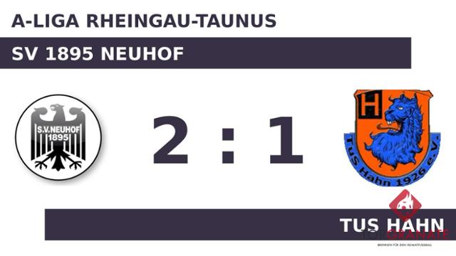 Ein frühes Ende hatte das Spiel für Luca Schmidli vom TuS Hahn, der in der elften Minute vom Platz musste und von Erik Repp ersetzt wurde. Nach nur 18 Minuten verließ Masoud Joz Delshadian vom Gast das Feld, Niklas Carl kam in die Partie. Vor dem Seitenwechsel sorgte Maurizio Tesini mit seinem Treffer für eine kalte Dusche für den TuS Hahn. Die SV 1895 Neuhof hatte zur Pause eine knappe Führung auf dem Zettel stehen. Jan Wendler versenkte die Kugel zum 2:0 für den Gastgeber (55.). Das 1:2 des TuS Hahn stellte Christian Schleihauf sicher (62.). Nach Beendigung der zweiten Halbzeit hieß das Ergebnis 2:1 zugunsten der SV Neuhof.
