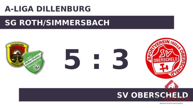 Nico Schmidt brachte den SV Oberscheld in der sechsten Spielminute in Führung. Lorenz Bastian witterte seine Chance und schoss den Ball zum 1:1 für die SG Roth/Simmersbach ein (13.). Das letzte Tor der turbulenten Startphase markierte Felix Heintz in der 21. Minute. Der SV Oberscheld war gewillt auszugleichen. Bis zum Seitenwechsel sprang jedoch nichts Zählbares mehr heraus. Für das zweite Tor der Gäste war Dominic Becker verantwortlich, der in der 52. Minute das 2:2 besorgte. Der Treffer zum 3:2 sicherte der SG Roth/Simmersbach nicht nur die Führung – es war auch bereits der zweite von Bastian in diesem Spiel (65.). Geschockt zeigte sich der SV Oberscheld nicht. Nur wenig später war Schmidt mit dem Ausgleich zur Stelle (66.). Bastian traf zum 4:3 zugunsten der SG Roth/Simmersbach (72.). In der 83. Minute brachte Jan Theiss das Netz für das Heimteam zum Zappeln. Schließlich strich die SG Roth/Simmersbach die Optimalausbeute gegen den SV Oberscheld ein.