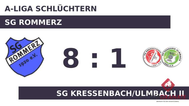 Kaum war das Spiel angepfiffen, lag die SG Rommerz bereits in Front. Jascha Etzel markierte in der ersten Minute die Führung. Die Rommerzer machten weiter Druck und erhöhten den Spielstand im Eilschritt durch einen Treffer von Michael Ruppert (10.). In der 21. Minute verwandelte Maximilian Leitschuh dann einen Elfmeter für die SGR zum 3:0. Mit einer deutlichen Führung der Blau-Weißen ging es in die Halbzeitpause. Mit dem 4:0 durch Etzel schien die Partie bereits in der 55. Minute mit den Gastgebern einen sicheren Sieger zu haben. Justin Wolf erzielte in der 56. Minute den Ehrentreffer für die SG KU II. Die SG Rommerz baute die Führung aus, indem Dawid Januszewski zwei Treffer nachlegte (58./72.). Bei der SG Kressenbach/Ulmbach II ging in der 76. Minute der etatmäßige Keeper Nils Kornherr raus, für ihn kam Alexander Eberl. Leitschuh schraubte das Ergebnis in der 77. Minute mit dem 7:1 für die SG Rommerz in die Höhe. Etzel stellte wenige Minuten vor dem Schlusspfiff den Stand von 8:1 für die SG Rommerz her (86.). Schlussendlich setzte sich die SG Rommerz mit acht Toren durch und machte bereits vor dem Seitenwechsel klar, welche Mannschaft als Sieger vom Platz gehen würde.