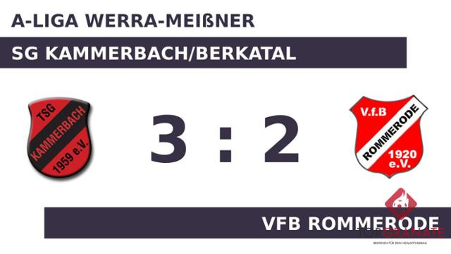 Jan Trapp brachte den VfB Rommerode in der 14. Minute ins Hintertreffen. Kurz vor der Pause traf Samie Aouina für die Gäste (41.). Ohne weitere Tore ging es in die Pause. Der Treffer zum 2:1 sicherte Kammerbach/Berkatal nicht nur die Führung – es war auch bereits der zweite von Trapp in diesem Spiel (59.). In der 66. Minute brachte Lukas Schüler das Netz für das Heimteam zum Zappeln. Für das zweite Tor des VfB Rommerode war Miguel Weber verantwortlich, der in der 77. Minute das 2:3 besorgte. Mit dem Schlusspfiff durch Schiedsrichter Stephan Schulz (Felsberg) gewann die SG Kammerbach/Berkatal gegen den VfB Rommerode.