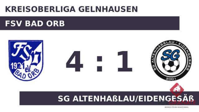 Mit einem schnellen Doppelpack (27./30.) zum 2:0 schockte Vincenzo Montaldo das Altenhaßlau/Eid. Die Hintermannschaft der Zweier-Spielgemeinschaft ließ bis zur Pause kein weiteres Tor zu und es ging bei unverändertem Stand in die Kabinen. Für das 3:0 des FSV Bad Orb sorgte Bjoern Emmer, der in Minute 63 zur Stelle war. Moritz Bohlender verkürzte für die SG Altenhaßlau/Eidengesäß später in der 71. Minute auf 1:3. Gianluca Koch stellte wenige Minuten vor dem Schlusspfiff den Stand von 4:1 für den FSV Bad Orb her (86.). Schlussendlich verbuchte der FSV Bad Orb gegen das Altenhaßlau/Eid. einen überzeugenden Heimerfolg.