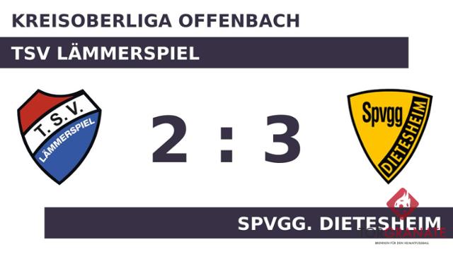 Die Spvgg. Dietesheim erwischte einen Blitzstart ins Spiel. Elon Derguti traf in der dritten Minute zur frühen Führung. Für das 2:0 der Dietesheimer zeichnete Atilla Manav verantwortlich (17.). Bis zur Pause fiel kein weiteres Tor, sodass die Spvgg. mit einer Führung in die Kabine ging. Rafael Mitsopoulos brachte den Gast in ruhiges Fahrwasser, indem er das 3:0 erzielte (61.). Eine starke Leistung zeigte Tobias Hilberger, der sich mit einem Doppelpack für den TSV Lämmerspiel beim Trainer empfahl (66./78.). Nachdem das Heimteam zunächst völlig von der Rolle gewesen war, zog es sich am Ende zumindest noch achtbar aus der Affäre. Zu einem Punktgewinn reichte es jedoch nicht mehr.