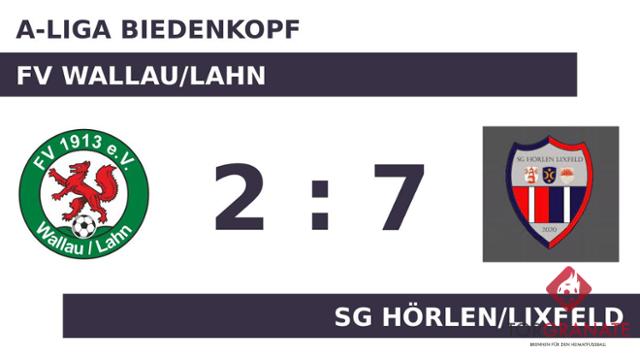 Heiko Biesenthal schoss in der 15. Minute vom Elfmeterpunkt das erste Tor des Spiels für den FV Wallau/Lahn. Die passende Antwort hatte Jakob Weigel parat, als er in der 18. Minute zum Ausgleich traf. In der 25. Minute erzielte Marcel Stark das 2:1 für den FV Wallau/Lahn. Die Führung hielt allerdings nur zwei Minuten. Ein Eigentor brachte den Ausgleich für die SG Hörlen/Lixfeld (27.). Das letzte Tor der turbulenten Startphase markierte Tobias Wilhelm in der 30. Minute. Bis zum Halbzeitpfiff blieb der knappe Vorsprung der SG Hörlen/Lixfeld bestehen. Mit einem Wechsel – Julian Bloecher kam für Luke Theofel – startete der FV Wallau/Lahn in Durchgang zwei. Spielstark zeigte sich die SG Hörlen/Lixfeld, als Silas Weigel (60.) und Jakob Weigel (64.) innerhalb weniger Minuten für die Vorentscheidung sorgten. Christian Pfeiffer beseitigte mit seinen Toren (78./81.) die letzten Zweifel am Sieg des Gasts. Die SG Hörlen/Lixfeld überrannte den FV Wallau/Lahn förmlich mit sieben Toren und fährt so mit einem verdienten Sieg in der Tasche nach Hause.