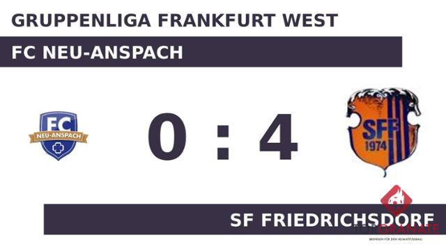Vincenzo Borzellino brachte SF Friedrichsdorf nach 28 Minuten die 1:0-Führung. Kurz vor dem Halbzeitpfiff (45.) baute Christopher Skoczny die Führung der Gäste aus. Es waren die Gäste, die zur Pause eine Führung ihr Eigen nannten. In der Pause stellte der FC Neu-Anspach personell um: Per Doppelwechsel kamen Tobias Hagen und Ismael Sy auf den Platz und ersetzten Stephan Damm und Niclas van der Straeten. Mit dem Tor zum 3:0 steuerte Borzellino bereits seinen zweiten Treffer an diesem Tag bei (54.). Eigentlich war der FC Neu-Anspach schon geschlagen, als Turgay Akbulut das Leder zum 0:4 über die Linie beförderte (66.). Letztlich fuhr SF Friedrichsdorf einen souveränen Erfolg ein, dessen Grundstein im ersten Spielabschnitt gelegt worden war.