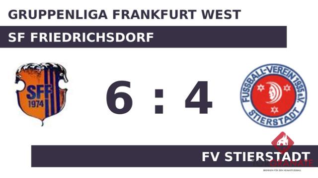 Lucas Doll brachte den Gastgeber in der siebten Minute ins Hintertreffen. Turgay Akbulut traf zum 1:1 zugunsten des Tabellenführers (19.). Tim Pelka beförderte das Leder zum 2:1 des FV Stierstadt in die Maschen (30.). SF Friedrichsdorf zeigte sich unbeeindruckt und so drehten Vincenzo Borzellino (32.) und Okan Koyun (37.) mit ihren Treffern das Spiel. Die Pausenführung von SF Friedrichsdorf fiel knapp aus. Mit einem Wechsel – Finn Prywer kam für Nick Leon Flohr – startete der FV Stierstadt in Durchgang zwei. Mit dem Tor zum 4:2 steuerte Borzellino bereits seinen zweiten Treffer an diesem Tag bei (47.). Es folgte der Anschlusstreffer für den FV Stierstadt – bereits der zweite für Pelka. Nun stand es nur noch 3:4 (58.). Andre Fließ erhöhte für SF Friedrichsdorf auf 5:3 (61.). Ab der 66. Minute bereicherte der für Christopher Skoczny eingewechselte Justin Pierre SF Friedrichsdorf im Vorwärtsgang. Für das 4:5 des FV Stierstadt zeichnete Pelka verantwortlich (73.). Mit dem 6:4 sicherte Fließ SF Friedrichsdorf nicht nur den Sieg, sondern erzielte auch seinen zweiten Tagestreffer (83.). Kurz vor dem Ende des Spiels nahm der FV Stierstadt noch einen Doppelwechsel vor, sodass Levi Ofoe und Marco Rollow für Davide Pedergnana und Ali Üzer weiterspielten (87.). Unter dem Strich verbuchte SF Friedrichsdorf gegen den FVS einen 6:4-Sieg.