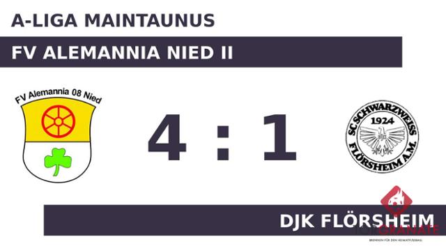 Kai Brandenburger stellte die Weichen für das Heimteam auf Sieg, als er in Minute 29 mit dem 1:0 zur Stelle war. Kurz vor dem Pfiff zur Halbzeit machte Eugen Schwarz das 2:0 zugunsten des FV Alemannia Nied II (41.). Ehe es in die Kabinen ging, markierte Salvatore Picerno das 1:2 für die DJK Flörsheim (45.). Zur Pause wusste der FV Alemannia Nied II eine hauchdünne Führung auf der Habenseite. In der 75. Minute brachte Ruben Sanchez Mendez das Netz für den FV Alemannia Nied II zum Zappeln. Schwarz stellte schließlich in der 80. Minute den 4:1-Sieg für den FV Alemannia Nied II sicher. Mit Ablauf der Spielzeit schlug der FV Alemannia Nied II die DJK Flörsheim 4:1.