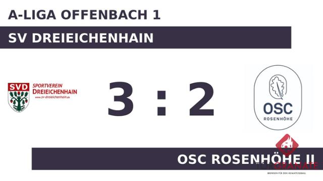 Der OSC Rosenhöhe II geriet schon in der achten Minute in Rückstand, als Hammad Geith das schnelle 1:0 für den SV Dreieichenhain erzielte. In der 20. Minute verwandelte Sabatino Prevete dann einen Elfmeter für den OSC Rosenhöhe II zum 1:1. Michael Josef Eyob stellte die Weichen für den SV Dreieichenhain auf Sieg, als er in Minute 32 mit dem 2:1 zur Stelle war. Geith schnürte mit seinem zweiten Treffer einen Doppelpack und brachte seine Mannschaft auf die Siegerstraße (36.). Mit der Führung für den SV Dreieichenhain ging es in die Halbzeitpause. Für das zweite Tor des OSC Rosenhöhe II war Antonio Geremias Bemcao verantwortlich, der in der 76. Minute das 2:3 besorgte. Obwohl dem SV Dreieichenhain nach erfolgreicher erster Hälfte keine weiteren Tore gelangen, schaffte es der OSC Rosenhöhe II zugleich nicht, die Partie zu drehen. Sie endete mit 3:2.