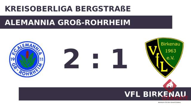 Marcel Eckhardt beförderte das Leder zum 1:0 von Groß-Rohrheim in die Maschen (11.). Florian Frölich nutzte die Chance für den VfL Birkenau und beförderte in der 18. Minute das Leder zum 1:1 ins Netz. Bis zur Halbzeit änderte sich am Stand nichts mehr und so ging es nach dem Pausenpfiff in den Kabinentrakt. Fezan Malik stellte die Weichen für Alemannia Groß-Rohrheim auf Sieg, als er in Minute 55 mit dem 2:1 zur Stelle war. Nach Beendigung der zweiten Halbzeit hieß das Ergebnis 2:1 zugunsten des Heimteams.
