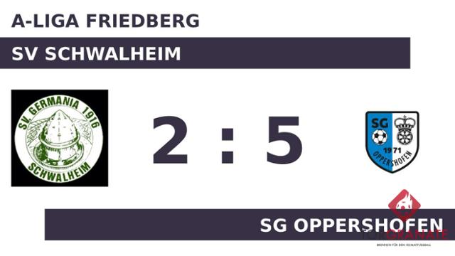 Nach nur 21 Minuten verließ Lukas Lottig von der SG Oppershofen das Feld, Lucas Link kam in die Partie. Kkonstantin Schreiner schoss in der 29. Minute vom Elfmeterpunkt das erste Tor des Spiels für den Gast. Kurz vor der Pause traf Maximilian Freundl für den SV Schwalheim (40.). Mario Rosi, der von der Bank für Marcel Lechner kam, sollte für neue Impulse beim Gastgeber sorgen (43.). Vor dem Seitenwechsel sorgte Paolo Fenski mit seinem Treffer für eine kalte Dusche für den SV Schwalheim. Zur Pause reklamierte die SG Oppershofen eine knappe Führung für sich. In Durchgang zwei lief Yoldas Yildiz anstelle von Patrick Czolnik für den SV Schwalheim auf. Für den nächsten Erfolgsmoment der SG Oppershofen sorgte Nick Bayer (64.), ehe Niklas Casties das 4:1 markierte (81.). Rosi traf zum 2:4 zugunsten des SV Schwalheim (83.). Schreiner gelang in den Schlussminuten noch ein weiterer Treffer für die SG Oppershofen (89.). Im Endeffekt kassierte der SV Schwalheim gegen einen direkten Konkurrenten im Abstiegskampf eine schmerzliche Niederlage.
