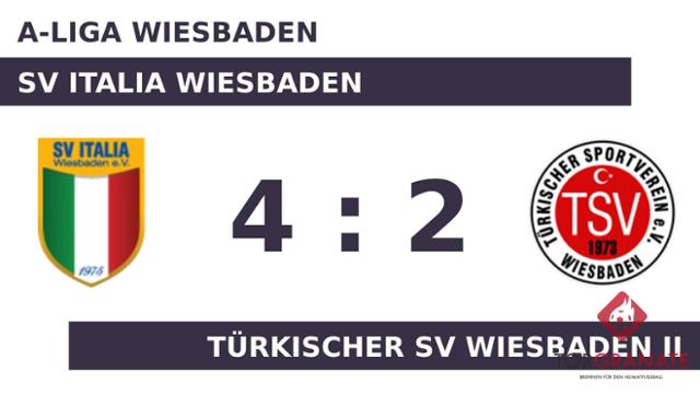 Spiridon Nakas brachte den Türkischer SV II in der 18. Minute ins Hintertreffen. Aschuram Odisho erhöhte den Vorsprung des SV Italia Wiesbaden nach 20 Minuten auf 2:0. Mit dem 3:0 von Habib Tolga Can für den Gastgeber war das Spiel eigentlich schon entschieden (28.). In der 42. Minute stellte der Türkischer SV Wiesbaden II personell um: Per Doppelwechsel kamen Anil Barlas und Yalcin Altin auf den Platz und ersetzten Can Acar und Furkan Karaahmet. Die beiden Mannschaften verabschiedeten sich schließlich mit der deutlichen Führung für den SV Italia Wiesbaden in die Pause. Burak Bektas verkürzte für den Türkischer SV II später in der 70. Minute auf 1:3. Für das zweite Tor des Gasts war Kaan Ünal verantwortlich, der in der 74. Minute das 2:3 besorgte. K. A. versenkte die Kugel zum 4:2 für den SV Italia Wiesbaden (84.). Schlussendlich verbuchte der SV Italia Wiesbaden gegen den Türkischer SV Wiesbaden II einen überzeugenden Heimerfolg.