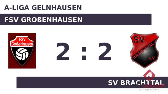 Der FSV erwischte einen Blitzstart ins Spiel. Filippo Travali traf in der fünften Minute zur frühen Führung. Bis zum Halbzeitpfiff blieb der knappe Vorsprung der Großenhausener bestehen. Zum Seitenwechsel ersetzte Jerome Richter von der Heimmannschaft seinen Teamkameraden Florian Mueller. In der 64. Minute erzielte Tim Hach das 1:1 für den SV Brachttal. Für das zweite Tor des FSV Großenhausen war Johannes Winter verantwortlich, der in der 73. Minute das 2:1 besorgte. Der Treffer, der Sebastian Lohrey in der 90. Minute gelang, bescherte seiner Mannschaft kurz vor dem Ende noch den Ausgleich. Schließlich gingen der FSV Großenhausen und der SV Brachttal mit einer Punkteteilung auseinander.
