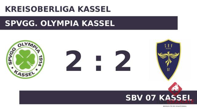 Die Spvgg. Olympia Kassel erwischte einen Blitzstart ins Spiel. Julian Harner traf in der sechsten Minute zur frühen Führung. Tugay Kanat war es, der in der 20. Minute das Spielgerät im Gehäuse der Heimmannschaft unterbrachte. Das letzte Tor der turbulenten Startphase markierte Marcel Schwarz in der 26. Minute. Komfortabel war die Pausenführung von Olympia Kassel nicht, aber immerhin ging die Spvgg. Olympia Kassel mit einem Tor Vorsprung in die Umkleidekabinen. Olympia Kassel musste den Treffer von Serif Kurt zum 2:2 hinnehmen (60.). Am Ende stand ein Teilerfolg für beide Mannschaften. Die Spvgg. Olympia Kassel und der SBV 07 Kassel spielten unentschieden.