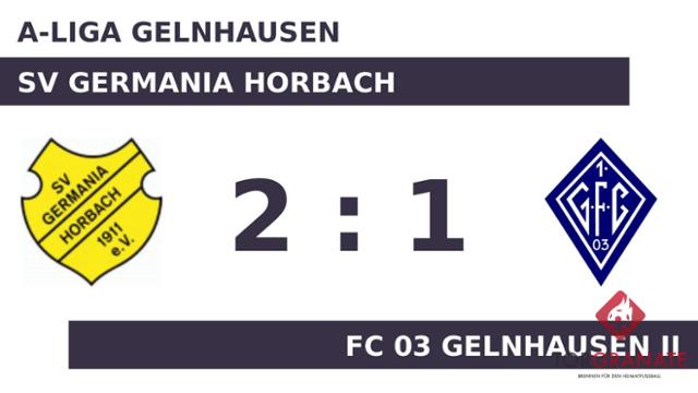 Für den Führungstreffer des SV Germania Horbach zeichnete Mirko Wicklein verantwortlich (9.). Marvin Meza nutzte die Chance für den FC 03 Gelnhausen II und beförderte in der 24. Minute das Leder zum 1:1 ins Netz. Der Unparteiische beendete die erste Halbzeit, ohne dass weitere Tore fielen. Dass der SV Germania Horbach in der Schlussphase auf den Sieg hoffte, war das Verdienst von Manuel Stadler, der in der 71. Minute zur Stelle war. Mit dem Schlusspfiff durch den Unparteiischen Erol Yilmaz (Frankfurt am Main) gewann der SVG gegen den FC 03 Gelnhausen II.