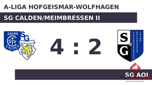 Kaum war das Spiel angepfiffen, lag Calden/Meimbr. II bereits in Front. Lennart Prieg markierte in der zweiten Minute die Führung. Bereits in der 13. Minute erhöhte David Gerdesmeier den Vorsprung des Gastgebers. Der Unparteiische beendete die erste Halbzeit, ohne dass weitere Tore fielen. Für das 3:0 der SG Calden/Meimbressen II sorgte Steven Kranitz, der in Minute 62 zur Stelle war. Mario Plutz schoss die Kugel zum 1:3 für die SG AOI über die Linie (68.). Das 2:3 der Gäste bejubelte Dennis Weide (86.). Wenig später verwandelte Stefan Dürrbaum einen Elfmeter zum 4:2 zugunsten von Calden/Meimbr. II (89.). Schlussendlich verbuchte die SG Calden/Meimbressen II gegen die SG AOI einen überzeugenden Heimerfolg.