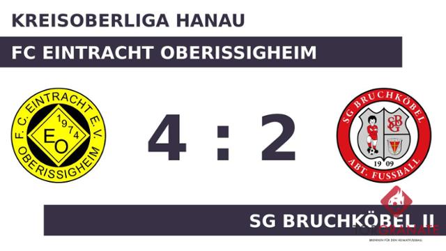 Für den Führungstreffer des Gastgebers zeichnete Patrick Erbe verantwortlich (15.). Den Freudenjubel des FC Eintracht Oberissigheim machte Dustin Koeneke zunichte, als er kurz darauf den Ausgleich besorgte (20.). Das letzte Tor der turbulenten Startphase markierte Dennis Liedtke in der 25. Minute. Das Eintr. Oberissigheim war gewillt auszugleichen. Bis zum Seitenwechsel sprang jedoch nichts Zählbares mehr heraus. Maximilian Walter schockte die SG Bruchköbel II und drehte die Partie mit seinem Doppelpack für den FC Eintracht Oberissigheim (53./59.). Mirco Schwarzer machte in der 79. Minute das 4:2 des Eintr. Oberissigheim perfekt. Am Ende verbuchte der FC Eintracht Oberissigheim gegen die SG Bruchköbel II einen Sieg.