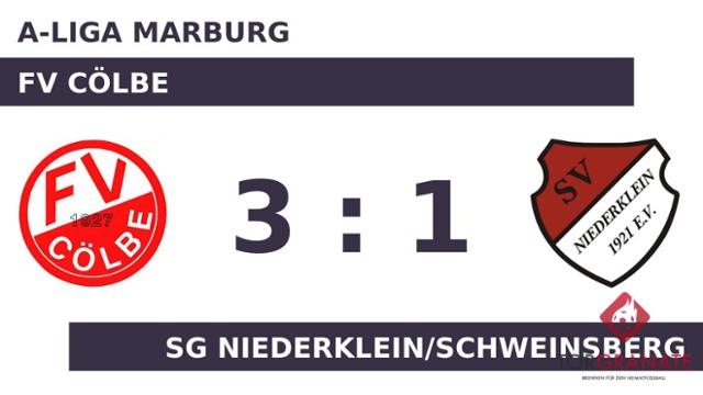 Die Niederk./Schweinsb. ging durch Till Botthof in der 38. Minute in Führung. Ehe der Schiedsrichter Sükrü Yüksel Firat (Lollar) die Akteure zur Pause bat, erzielte Lennart Kuhn aufseiten des FV Cölbe das 1:1 (45.). Zur Halbzeit war die Partie noch vollkommen offen. Remis lautete das Zwischenresultat. Kuhn schnürte mit seinem zweiten Treffer einen Doppelpack und brachte seine Mannschaft auf die Siegerstraße (58.). Thomas Langenhorst stellte wenige Minuten vor dem Schlusspfiff den Stand von 3:1 für den FV Cölbe her (90.). Im Endeffekt kassierte die SG Niederklein/Schweinsberg gegen einen direkten Konkurrenten im Abstiegskampf eine schmerzliche Niederlage.