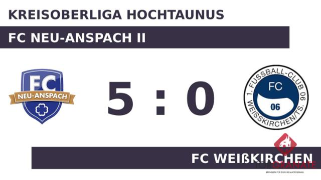 Gerome Dominic Rossner brachte den FC Neu-Anspach II in der sechsten Minute nach vorn. Zum psychologisch ungünstigen Zeitpunkt vor der Halbzeit (45.) schoss Manuel Müller einen weiteren Treffer für das Heimteam. Mit der Führung für den FC Neu-Anspach II ging es in die Kabine. Rossner baute den Vorsprung des FC Neu-Anspach II in der 53. Minute aus. David Saco Hildago überwand den gegnerischen Schlussmann zum 4:0 für den FC Neu-Anspach II (58.). Ehe der Abpfiff ertönte, war es Hueseyin Durak, der das 5:0 aus Sicht des FC Neu-Anspach II perfekt machte (88.). Letztlich feierte der FC Neu-Anspach II gegen den FC Weißkirchen nach einer überzeugenden Darbietung einen verdienten Heimsieg.