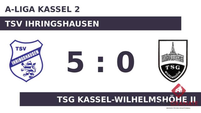 Tim Brödner schoss in der fünften Minute vom Elfmeterpunkt das erste Tor des Spiels für die Heimmannschaft. Chris Mucha beförderte das Leder zum 2:0 des TSV Ihringshausen über die Linie (30.). Bis zum Pausenpfiff blieb der Stand unverändert. Ferris Sonnenschein überwand den gegnerischen Schlussmann zum 3:0 für den TSV Ihringshausen (70.). Marcel Kahl baute den Vorsprung des TSV Ihringshausen in der 74. Minute aus. Sonnenschein gelang in den Schlussminuten noch ein weiterer Treffer für den TSV Ihringshausen (83.). Letztlich feierte der TSV Ihringshausen gegen die TSG Wilhelmshöhe II nach einer überzeugenden Darbietung einen verdienten Heimsieg.