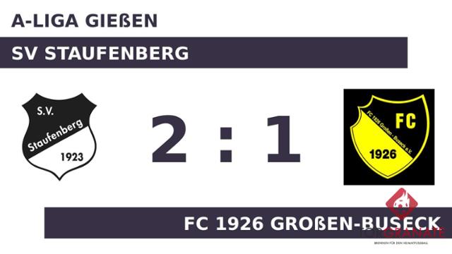 Ein frühes Ende hatte das Spiel für Luca Plomitzer vom FC Großen-Buseck, der in der elften Minute vom Platz musste und von Nils Christian Richter ersetzt wurde. Sascha Koch brachte den SV Staufenberg in der 22. Minute in Front. Nach nur 30 Minuten verließ Mohamed Amir vom FC 1926 Großen-Buseck das Feld, Niklas Nolte kam in die Partie. Um den entscheidenden Deut besser war zur Pause der SV Staufenberg, sodass es mit einer dünnen Führung in die Kabine ging. In Durchgang zwei lief Alban Kastrati anstelle von Nicodemo Birkenfelder für den Gastgeber auf. Mathis Lang versenkte den Ball in der 56. Minute im Netz des SV Staufenberg. Die spielentscheidende Rolle nahm Daniel Stein ein, der kurz vor knapp für den SV Staufenberg zum Führungstreffer bereitstand (90.). Als Referee Peter Picha (Gladenbach) die Begegnung beim Stand von 2:1 letztlich abpfiff, hatte der SV Staufenberg die drei Zähler unter Dach und Fach.