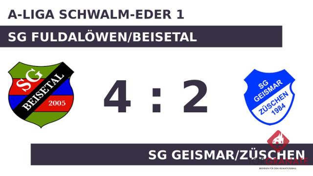 Robin Schäfer brachte sein Team in der 15. Minute nach vorn. In der 35. Minute erzielte Tom Holzhauer das 1:1 für die SG Fuldalöwen/Beisetal. Bevor es in die Pause ging, hatte Safi Eddine Adjout noch das 2:1 des Ligaprimus parat (45.). Die Pausenführung von Fuldalöwen/Beisetal fiel knapp aus. Die nächsten beiden Treffer waren einem Mann vorbehalten: Pascal Seitz schnürte einen Doppelpack (47./68.), sodass die SG Fuldalöwen/Beisetal fortan mit 4:1 führte. Die SG Geismar/Züschen verkürzte den Rückstand in der 90. Minute durch einen Elfmeter von Christopher Schäfer auf 2:4. Schließlich sprang für Fuldalöwen/Beisetal gegen die SG Geismar/Züschen ein Dreier heraus.