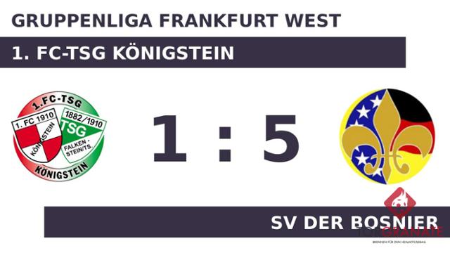 Ein Doppelpack brachte den SV der Bosnier in eine komfortable Position: Adis Hasecic war gleich zweimal zur Stelle (14./22.). Bis zur Halbzeitpause konnte keine der Mannschaften ihre Torbilanz mehr verbessern. Hamza Reko baute den Vorsprung des SV der Bosnier in der 48. Minute aus. In der 56. Minute stellte der 1. FC-TSG Königstein personell um: Per Doppelwechsel kamen Deniz Cayli und Cedric Schrodt auf den Platz und ersetzten Fabio Buscemi und Jonas Löffler. Für das 1:3 der Königsteiner zeichnete Krish Raweri verantwortlich (62.). Ersan Rovcanin vollendete zum fünften Tagestreffer in der 68. Spielminute. Eldin Kurtanovic stellte schließlich in der 87. Minute den 5:1-Sieg für den SV der Bosnier sicher. Letztlich fuhr der Sportverein der Bosnier einen souveränen Erfolg ein, dessen Grundstein im ersten Spielabschnitt gelegt worden war.