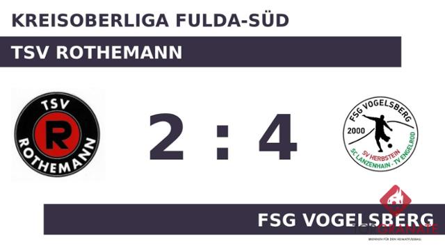 Für Moritz Baier war der Einsatz nach 15 Minuten vorbei. Für ihn wurde Dominik Geist eingewechselt. Für den Führungstreffer der FSG Vogelsberg zeichnete Lars Bourscheidt verantwortlich (19.). Fabian Lehmann erhöhte für die FSG auf 2:0 (20.). Ohne weitere Tore ging es in die Pause. Für ruhige Verhältnisse sorgte Bourscheidt, als er das 3:0 für die FSG Vogelsberg besorgte (54.). Jakob Müglich beförderte das Leder zum 1:3 des TSV Rothemann in die Maschen (57.). Peter Bourscheidt baute den Vorsprung der FSG Vogelsberg in der 81. Minute aus. Yannick Hohmann ließ sich in der 87. Minute nicht zweimal bitten und verwertete zum 2:4 für den TSV Rothemann. Schließlich sprang für die FSG Vogelsberg gegen den TSV Rothemann ein Dreier heraus.