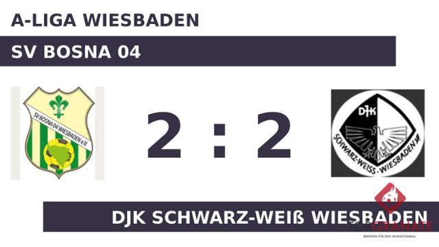 Nach den ersten 45 Minuten ging es für die Heimmannschaft und die DJK SW Wiesbaden ohne Torerfolg in die Kabinen. Nick Brabender brachte die DJK Schwarz-Weiß Wiesbaden in der 51. Minute nach vorn. Mit einem schnellen Doppelpack (55./60.) zum 2:1 schockte Armin Sabanovic die Gäste und drehte das Spiel. Wenig später kamen Hasan Dzinic und Redouan Haddouzi per Doppelwechsel für Elmin Kurtisi und Ervin Drazevicanin auf Seiten des SV Bosna 04 ins Match (67.). Joshua Eilenstein, der von der Bank für Nico Paul Knörzer kam, sollte für neue Impulse bei der DJK SW Wiesbaden sorgen (80.). Für den Gleichstand, der kurz vor dem Ende zustande kam, zeichnete Eilenstein mit seinem Treffer aus der 86. Minute verantwortlich. Letztlich gingen der SV Bosna 04 und die DJK Schwarz-Weiß Wiesbaden mit jeweils einem Punkt auseinander.