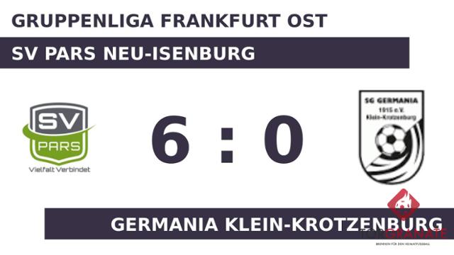 Für den Führungstreffer des SV Pars Neu-Isenburg zeichnete Dejan Alempic verantwortlich (16.). Sinisa Alempic brachte den Ball zum 2:0 zugunsten des SV Pars über die Linie (31.). Kurz vor dem Halbzeitpfiff (43.) baute Efkan Erdem die Führung der Neu-Isenburger aus. Noch bevor es in die Halbzeit ging, war Leon Burggraf mit dem 4:0 für die Gastgeber zur Stelle (45.). Das überzeugende Auftreten des Tabellenprimus fand Ausdruck in einer klaren Halbzeitführung. Wenig später kamen Kaan Seker und Tobias Wilhelm per Doppelwechsel für Maximilian Schoesser und Noel Bauer auf Seiten des Klein-Krotzenburg ins Match (76.). Sinisa Alempic schraubte das Ergebnis in der 85. Minute mit dem 5:0 für den SV Pars Neu-Isenburg in die Höhe. Angelo De Carvalho gelang in den Schlussminuten noch ein weiterer Treffer für den SV Pars Neu-Isenburg (90.). Mit dem Spielende fuhr der SV Pars Neu-Isenburg einen Kantersieg ein. Bereits vor dem Seitenwechsel war für die Germania Klein-Krotzenburg klar, dass gegen den SV Pars Neu-Isenburg heute kein Kraut gewachsen war.