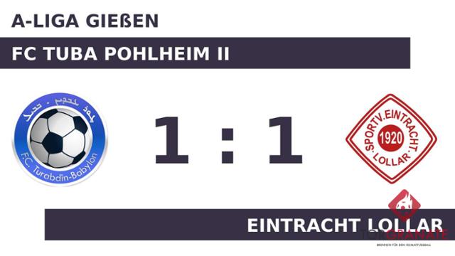 Für den Führungstreffer der Eintracht Lollar zeichnete Sergej Maro verantwortlich (35.). Der Gast nahm die knappe Führung mit in die Kabine. Tekin Simon traf zum 1:1 zugunsten des FC TuBa Pohlheim II (55.). Letzten Endes wurde im Aufeinandertreffen des FC TuBa Pohlheim II mit der Eintracht Lollar kein Sieger ermittelt.
