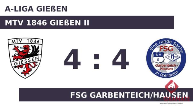 Auf die vermeintliche Siegerstraße brachte Ivo David Gutmann sein Team in der 23. Minute. Die Antwort ließ nicht lange auf sich warten. Wenige Augenblicke später besorgte Florian Pinkl den Ausgleich (26.). Joshua Zaborowski nutzte die Chance für den MTV 1846 Gießen II und beförderte in der 32. Minute das Leder zum 2:1 ins Netz. Zur Pause behielt das Heimteam die Nase knapp vorn. Die Garbenteich/Hausen trumpfte auf und Altan Ucar (50.), Gabriel Danho (52.) und Philipp Heyse (54.) drehten das Spiel innerhalb weniger Minuten auf 4:2. Es folgte der Anschlusstreffer für den MTV 1846 Gießen II – bereits der zweite für Zaborowski. Nun stand es nur noch 3:4 (66.). Kurz vor Ultimo war noch Carlo Staudt zur Stelle und zeichnete für das vierte Tor des MTV 1846 Gießen II verantwortlich (83.). Schließlich gingen der MTV 1846 Gießen II und die FSG Garbenteich/Hausen mit einer Punkteteilung auseinander.