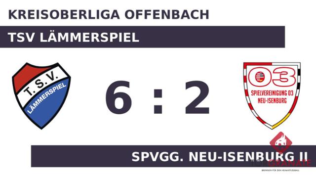 Tobias Hilberger brachte sein Team in der zwölften Minute nach vorn. Calvin Rufino nutzte die Chance für den TSV Lämmerspiel und beförderte in der 21. Minute das Leder zum 2:0 ins Netz. Weitere Tore gab es bis zum Pausenpfiff nicht und so ging es mit der Führung der Heimmannschaft in die Kabine. Der TSV Lämmerspiel musste den Treffer von Maazin Adam Ahmed zum 1:2 hinnehmen (47.). Die Freude der Spvgg. Neu-Isenb. II über den Anschlusstreffer währte allerdings nicht lange. Marco Schaub (51.), Hilberger (66.) und Nico Heinz (69.) ließen an der Dominanz des TSV Lämmerspiel keinen Zweifel aufkommen. Mit dem Treffer zum 2:5 in der 73. Minute machte Adam Ahmed zwar seinen Doppelpack perfekt – der Rückstand zum TSV Lämmerspiel war jedoch weiterhin gewaltig. Tobias Dieter vollendete zum achten Tagestreffer in der 78. Spielminute. Letztlich feierte der TSV Lämmerspiel gegen die Spvgg. Neu-Isenburg II nach einer überzeugenden Darbietung einen verdienten Heimsieg.