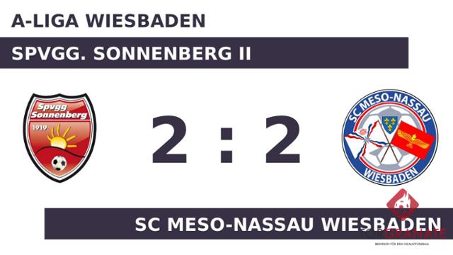 Auf die vermeintliche Siegerstraße brachte Elias Maximilian Fiedler sein Team in der 16. Minute. Noah Ocak musste nach nur 20 Minuten vom Platz, für ihn spielte Matay Yildiz weiter. Die Spvgg. Sonnenberg II musste den Treffer von Christian Gharibo zum 1:1 hinnehmen (34.). Zum Seitenwechsel hatte keine Mannschaft die Oberhand gewonnen. Unentschieden lautete der Zwischenstand. In der Pause stellte der SC Meso-Nassau Wiesbaden personell um: Per Doppelwechsel kamen Azad Yasar und Gabriel Kontar auf den Platz und ersetzten Joshua Ercin und Gharibo. Nils Kapral versenkte die Kugel zum 2:1 (55.). Mund abputzen und weitermachen: Unter diesem Motto stand der Ausgleich, den Gabriel Yacoub bereits wenig später besorgte (57.). Letztlich trennten sich die Spvgg. Sonnenberg II und der SC Meso-Nassau remis.