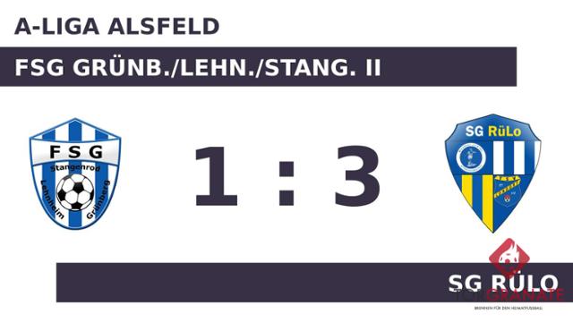 Leon Haberkorn brachte die SG RüLo in der siebten Spielminute in Führung. Bereits in der 14. Minute erhöhte Thomas Gaier den Vorsprung des Gasts. Das letzte Tor der turbulenten Startphase markierte Jan Meinusch in der 28. Minute. Den Unterschied zwischen den beiden Mannschaften machte bis zur Pause lediglich ein Treffer aus, den die SG RüLo für sich beanspruchte. Die SG RüLo kehrte stark verändert aus der Kabine zurück. Statt Paul Becker, Michael Baumbach und Nico Bastian standen jetzt Marc Bastian, Christian Sautner und Daniel Baumbach auf dem Platz. In der Pause stellte die FSG Grünb./Lehn./Stang. II personell um: Per Doppelwechsel kamen Luke Lindemann und Justin Mernberger auf den Platz und ersetzten Marian Ide und Leon Schaplow. Das 3:1 für die SG RüLo stellte Haberkorn sicher. In der 82. Minute traf er zum zweiten Mal während der Partie. Letzten Endes holte die SG RüLo gegen das Grünb/Lehnh/Stang II drei Zähler.