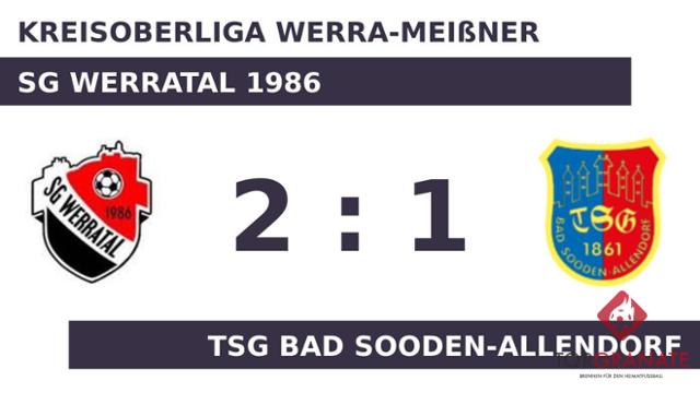 Thomas Berger war zur Stelle und markierte das 1:0 der TSG Bad Sooden-Allendorf (9.). Ehe der Unparteiische Fabian Gleim (Eschwege) die Akteure zur Pause bat, erzielte Ernst Marius Wille aufseiten der SG Werratal 1986 das 1:1 (40.). Zur Halbzeit war die Partie noch vollkommen offen. Remis lautete das Zwischenresultat. Leo Kelmendi machte in der 76. Minute das 2:1 der SG Werratal 1986 perfekt. Schließlich strich die SG Werratal 1986 die Optimalausbeute gegen Sooden-Allendorf ein.