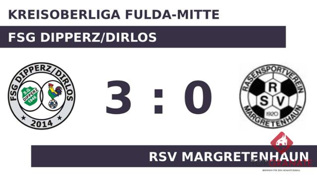 Oliver Bröcker brachte die FSG Dipperz/Dirlos in der 15. Minute in Front. Den Unterschied zwischen den beiden Mannschaften machte bis zur Pause lediglich ein Treffer aus, den die FSG für sich beanspruchte. In der Halbzeit nahm der RSV Margretenhaun gleich zwei Wechsel vor. Fortan standen Christian Klewitz und Dominik Hintze für Felix Bug und Jeremias Hess auf dem Platz. Johannes Heil schoss die Kugel zum 2:0 für die FSG Dipperz/Dirlos über die Linie (49.). Für ruhige Verhältnisse sorgte Lars Müller, als er das 3:0 für DiDi besorgte (70.). Die Gastgeber stellten in der 85. Minute personell um: Jonas Burkart ersetzte Müller und damit ein nomineller Verteidiger den anderen. Als Schiedsrichter Klaus Montag (Fulda) die Begegnung beim Stand von 3:0 letztlich abpfiff, hatte die FSG Dipperz/Dirlos die drei Zähler unter Dach und Fach.