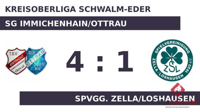 Für den Führungstreffer der Gastgeber zeichnete Pascal Rösener verantwortlich (35.). Ehe der Schiedsrichter Finn Lorenz (Borken (Hessen)) die Akteure zur Pause bat, erzielte Jan Niclas Hess aufseiten der SG Immichenhain/Ottrau das 2:0 (40.). Mit einem Elfmeter von Nils Reuter kam Zella/Loshausen noch einmal ran (43.). Ein Tor auf Seiten von Immichenhain/Ottrau machte zur Pause den Unterschied zwischen den beiden Mannschaften aus. Mike Bauer brachte den Ball zum 3:1 zugunsten der SG Immichenhain/Ottrau über die Linie (69.). Tobias Itzenhäuser legte in der 86. Minute zum 4:1 für Immichenhain/Ottrau nach. Im Endeffekt kassierte die SpVgg. Zella/Loshausen gegen einen direkten Konkurrenten im Abstiegskampf eine schmerzliche Niederlage.