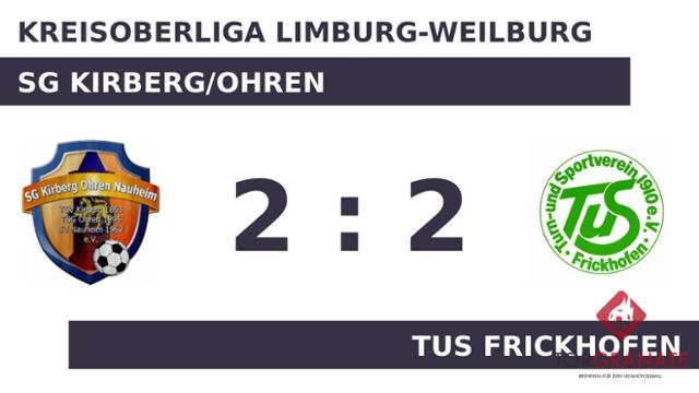 Für den Führungstreffer der SG Kirberg/Ohren zeichnete David Seibel verantwortlich (39.). Einen Torerfolg in Halbzeit eins verbuchten lediglich die Gastgeber, womit man eine knappe Führung mit in die Kabinen nahm. In der 51. Minute erzielte Mert Korkmaz das 1:1 für den TuS Frickhofen. Leon Lukas Hanis machte in der 55. Minute das 2:1 des Gasts perfekt. Bjoern Enderich sicherte seiner Mannschaft kurz vor dem Abpfiff den Ausgleich, als er in der 90. Minute ins Schwarze traf. Die 2:2-Punkteteilung war letztlich besiegelt, als der Unparteiische Baghdad Chikar (Hattersheim am Main) die Partie nach 90 Minuten abpfiff.