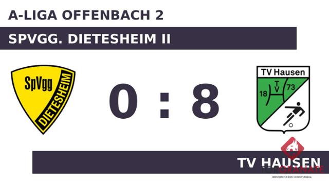 Hueseyin Tenekeci brachte den Gast in der 17. Minute in Front. Daniel Konczalla erhöhte den Vorsprung des TV Hausen nach 27 Minuten auf 2:0. Andre Mlivic überwand den gegnerischen Schlussmann zum 3:0 für den TV Hausen (34.). Zwei schnelle Treffer von Konczalla (36.) und Sebastian Langer (39.) sorgten für die Vorentscheidung zugunsten des TV Hausen. Der Spvgg. Dietesheim II wurde in Abschnitt eins das Fell über die Ohren gezogen: Immer wieder griff der Keeper der Heimmannschaft bis dahin hinter sich. Wenig später kamen Mohammed Moukhtari und Mike Weidner per Doppelwechsel für Timo Kreim und Konczalla auf Seiten des TV Hausen ins Match (55.). Doppelpack für den TV Hausen: Nach seinem ersten Tor (58.) markierte Weidner wenig später seinen zweiten Treffer (62.). Tobias Steinbrecher stellte schließlich in der 80. Minute mit einem Elfmeter den 8:0-Sieg für den TV Hausen sicher. Schlussendlich setzte sich der TV Hausen mit acht Toren durch und machte bereits vor dem Seitenwechsel klar, welche Mannschaft als Sieger vom Platz gehen würde.