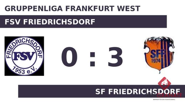 SF Friedrichsdorf konnte sich gegen den FSV Friedrichsdorf auf eine sattelfeste Defensive verlassen und mischt in der Tabelle weiter um die besten Plätze mit. Bei SF Friedrichsdorf greift die alte Fußballweisheit, wonach der Angriff Spiele gewinnt, die Abwehr aber Meisterschaften. Mit gerade einmal 19 Gegentoren stellt SF Friedrichsdorf die beste Defensive der Gruppenliga Frankfurt West. SF Friedrichsdorf sammelt weiterhin fleißig Erfolge, deren Zahl sich mittlerweile auf zehn summiert. In der Bilanz kommen noch vier Unentschieden und eine Niederlage dazu.