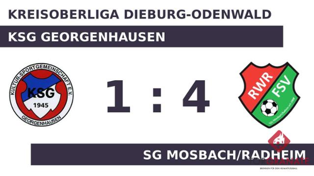 Für das 1:0 und 2:0 war Max Daniel verantwortlich. Der Akteur traf gleich zweimal ins Schwarze (9./26.). Für Luke Horvath war der Einsatz nach elf Minuten vorbei. Für ihn wurde Jan Niklas Oberdoerfer eingewechselt. Nikita Aman brachte die SG Mosbach/Radheim in ruhiges Fahrwasser, indem er das 3:0 erzielte (31.). Kurz vor dem Halbzeitpfiff (42.) baute Marvin Bernhard die Führung des Gasts aus. Zur Halbzeit blickte die SG Mosbach/Radheim auf einen klaren Vorsprung gegen einen Gegner, den man deutlich beherrschte. Zum Seitenwechsel ersetzte Adrian Rätzel von der KSG Georgenhausen seinen Teamkameraden Tom Henßel. Damien Raschke erzielte in der 57. Minute den Ehrentreffer für den Gastgeber. Obwohl der SG Mosbach/Radheim nach erfolgreicher erster Hälfte keine weiteren Tore gelangen, schaffte es die KSG Georgenhausen zugleich nicht, die Partie zu drehen. Sie endete mit 4:1.