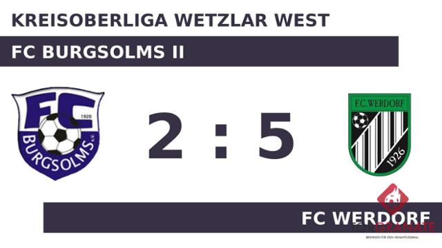 Patrick Schmidt schoss in der 31. Minute vom Elfmeterpunkt das erste Tor des Spiels für den Gastgeber. Um den entscheidenden Deut besser war zur Pause der FC Burgsolms II, sodass es mit einer dünnen Führung in die Kabine ging. In der Pause stellte der FC Werdorf personell um: Per Doppelwechsel kamen Tom Würtz und Erik Reich auf den Platz und ersetzten Janick Maurer und Manuel Habeck Lopes. Michael Bauer ließ sich in der 47. Minute nicht zweimal bitten und verwertete zum 2:0 für den FC Burgsolms II. Das 1:2 des FC Werdorf bejubelte Manuel Jung (50.). Reich glich nur wenig später für den Gast aus (53.). Zehn Minuten später ging der FC Werdorf durch den zweiten Treffer von Jung in Führung. Reich beseitigte mit seinen Toren (71./90.) die letzten Zweifel am Sieg des FC Werdorf. Letzten Endes ging der FC Werdorf im Duell mit dem FC Burgsolms II als Sieger hervor.