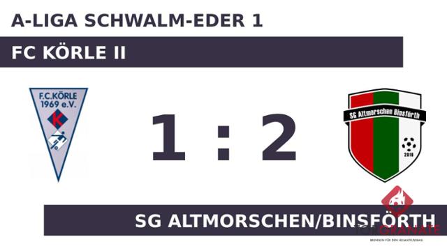 Auf die vermeintliche Siegerstraße brachte Leon Eberhardt sein Team in der 16. Minute. Bevor es in die Pause ging, hatte Noel Kämpfer noch das 1:1 der SG Altmorschen/Binsförth parat (42.). Einen Torerfolg in Halbzeit eins verbuchte lediglich der FC Körle II, womit man eine knappe Führung mit in die Kabinen nahm. Altmorschen/Binsf. gelangte durch ein Selbsttor des FC Körle II zur 2:1-Führung (78.). Letzten Endes ging die SG Altmorschen/Binsförth im Duell mit dem FC Körle II als Sieger hervor.