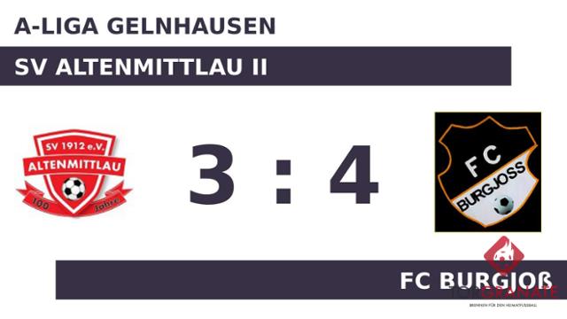 Auf die vermeintliche Siegerstraße brachte Jannik Trageser sein Team in der 14. Minute. Ensar Akbulut schockte den SV Altenmittlau II und drehte die Partie mit seinem Doppelpack für FC Burgjoß (26./38.). Mit einem Tor Vorsprung für FC Burgjoß ging es für die beiden Teams in die Halbzeitpause. Benjamin Praus schoss für den SV Altenmittlau II in der 59. Minute das zweite Tor. Dass FC Burgjoß in der Schlussphase auf den Sieg hoffte, war das Verdienst von Jose De Carvalho, der in der 78. Minute zur Stelle war. Mit dem Tor zum 4:2 steuerte Akbulut bereits seinen dritten Treffer an diesem Tag bei (89.). In der 90. Minute brachte Andreas Herrman den Ball im Netz von FC Burgjoß unter. Am Ende verbuchte FC Burgjoß gegen den SV Altenmittlau II einen Sieg.