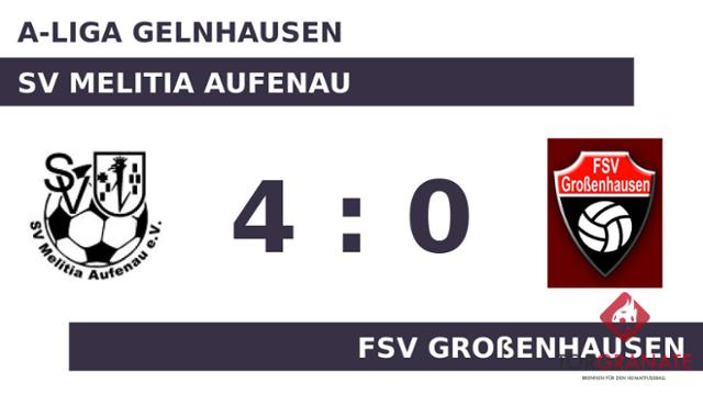 Sinan Aksuy trug sich in der 18. Spielminute in die Torschützenliste ein. Dieter Ganzwind versenkte die Kugel zum 2:0 für den SV Melitia Aufenau (30.). Die Hintermannschaft des FSV Großenhausen ließ bis zur Pause kein weiteres Tor zu und es ging bei unverändertem Stand in die Kabinen. Mit dem 3:0 durch Sascha Wieczorek schien die Partie bereits in der 59. Minute mit dem SV Melitia Aufenau einen sicheren Sieger zu haben. Ehe der Abpfiff ertönte, war es Richard Ganzwind, der das 4:0 aus Sicht des SVM perfekt machte (89.). Im Endeffekt kassierte der FSV Großenhausen gegen einen direkten Konkurrenten im Abstiegskampf eine schmerzliche Niederlage.