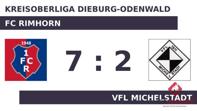 Dennis Uhrig brachte den Gastgeber in der siebten Spielminute in Führung. Kurz vor dem Halbzeitpfiff (45.) baute Sebastian Saufhaus die Führung des FC Rimhorn aus. Mit der Führung für den FC Rimhorn ging es in die Halbzeitpause. Der FC Rimhorn baute den Vorsprung mit der Hilfe des Gegners weiter aus: 3:0 für den FC Rimhorn durch ein Eigentor des VFL Michelstadt in der 50. Minute. Für das erste Tor des VFL Michelstadt war Jonathan Reimer verantwortlich, der in der 51. Minute das 1:3 besorgte. Mit dem 4:1 von Uhrig für den FC Rimhorn war das Spiel eigentlich schon entschieden (56.). Nisha Wagner schoss für den VFL Michelstadt in der 73. Minute das zweite Tor. Saufhaus besorgte in der Schlussphase schließlich den siebten Treffer für den FC Rimhorn (79.). Letztlich feierte der FC Rimhorn gegen den VFL Michelstadt nach einer überzeugenden Darbietung einen verdienten 7:2-Heimsieg.